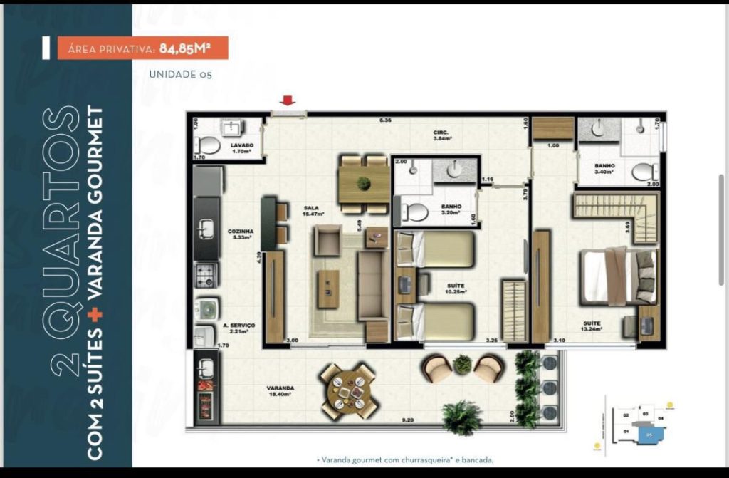 2 pavimentos, 4 vagas, 3 suites – sendo 2 com closet e varanda, sala ampla integrada com cozinha, lavanderia, área